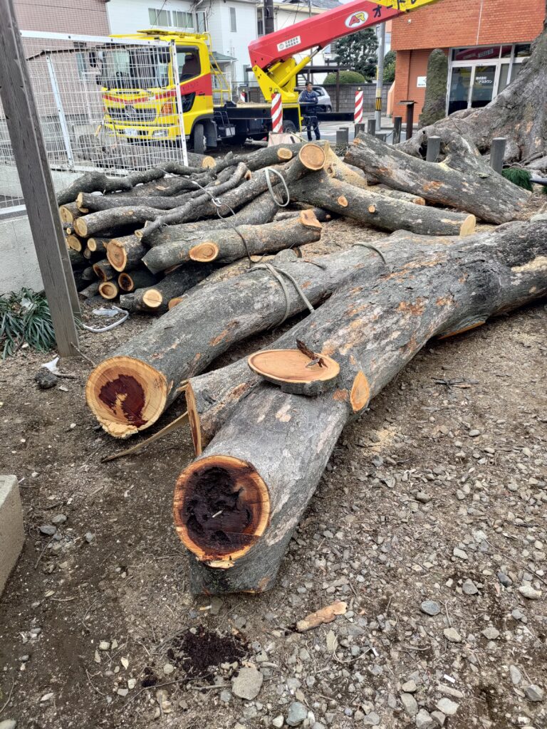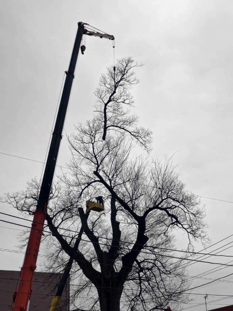 大きな重機を使って手際よく勧められ1日で作業が終了。推定樹齢600~1000年の老木なので、太い枝の内部が所々痛んでいました。末永く後世に残せるように見守っていきます。