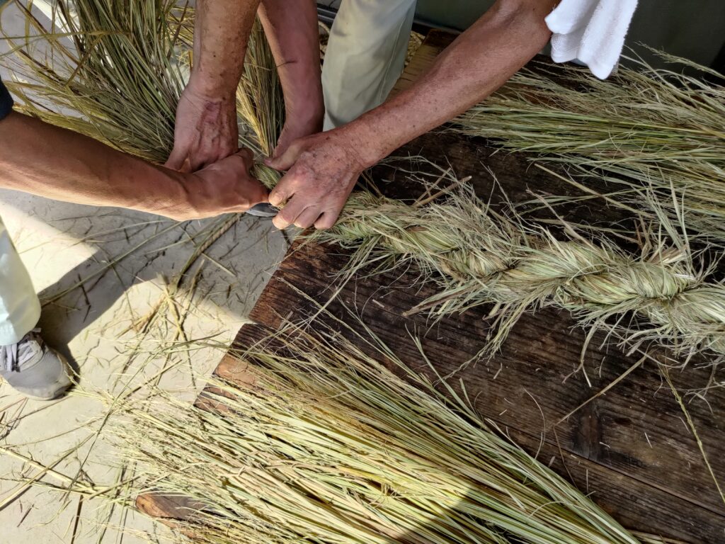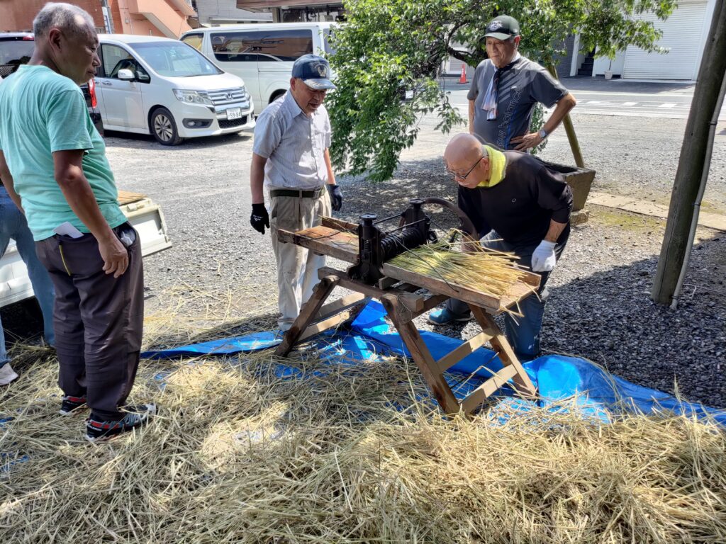 昔ながらの方法で注連縄を編み、鳥居に巻き付けて境内に建立。
