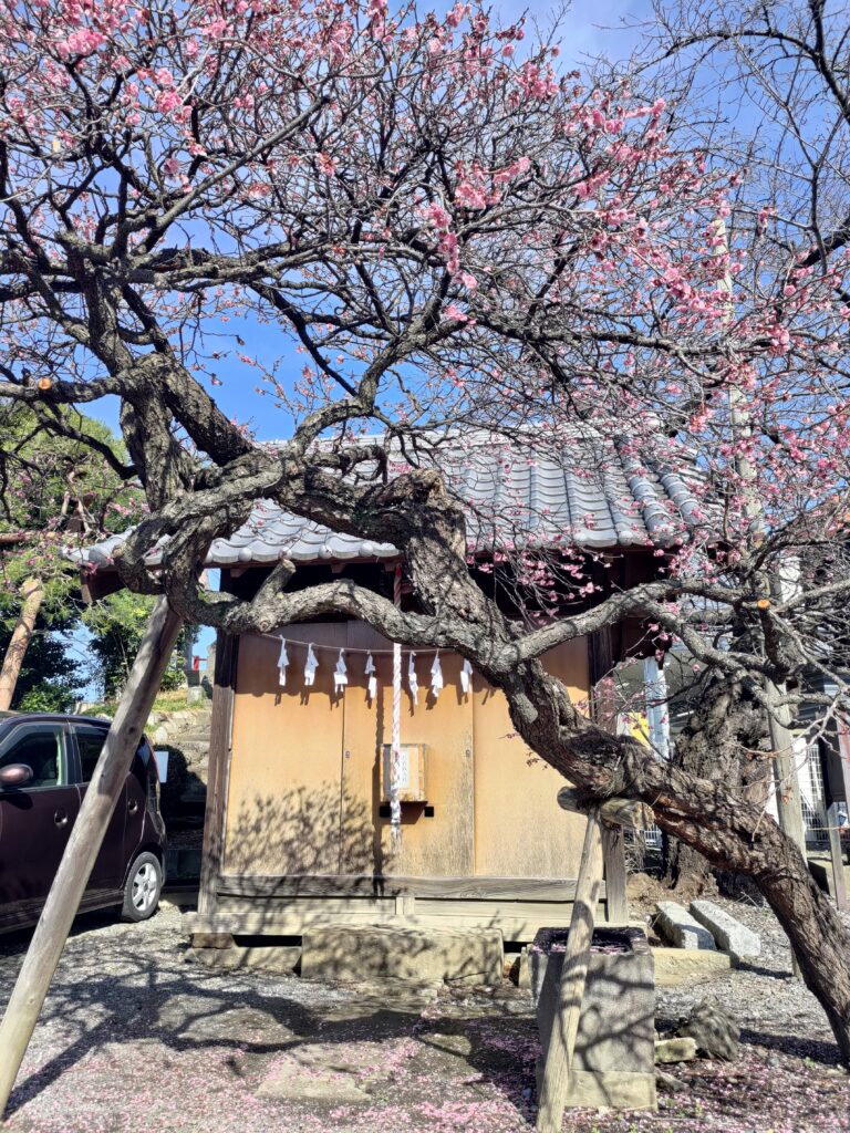 梅の木の奥にあるのが菅原道真公を祭った天神社です。学問の神であり毎年命日である2月25日に天神祭りの御祈祷を行っています。